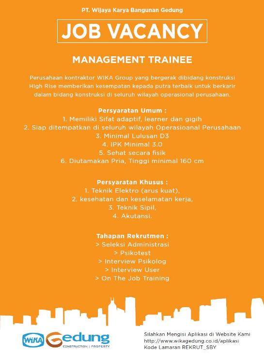 Pt wijaya karya (persero), biasa disebut wika, sebagai badan usaha milik negara (bumn) adalah hasil nasionalisasi perusahaan belanda, naamloze vennotschap technische handel maatschappij en bouwbedrijf vis en co disingkat nv vis. Your trust is our main concern so these ratings for pt wijaya karya (wika) are shared 'as is' from employees in line with our community guidelines. Gambaran pekerjaan info rekrutmen : Pendaftaran hanya lewat online tidak ada jalur yang lain. Lowongan pt wijaya karya posisi :